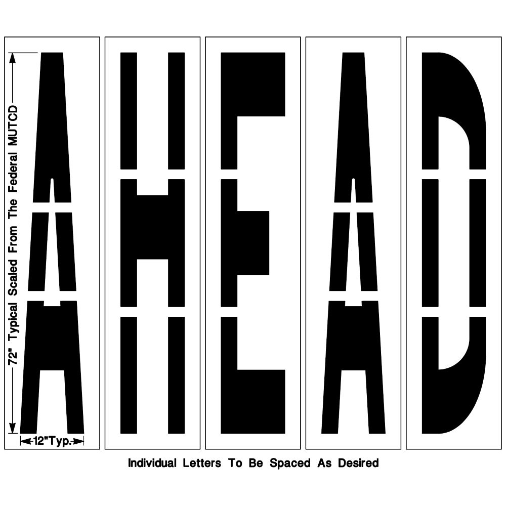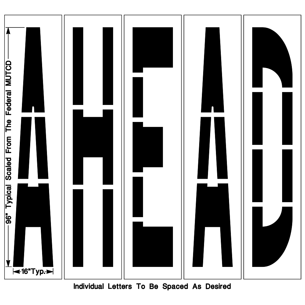 Our Federal AHEAD Stencil is used to mark roadways cleanly and safely. It meets Federal specifications and comes in three different stencil heights (48″, 72″ & 96″). Cut from 1/8″ PolyTough Plastic that comes with a Lifetime Warranty. Proudly Made in the USA.