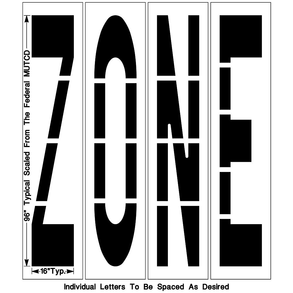 Our Federal ZONE Stencil is used to mark roadways cleanly and safely. It meets federal specifications and comes in three different stencil heights (48″, 72″ & 96″). Cut from 1/8″ PolyTough Plastic that comes with a Lifetime Warranty. Proudly Made in the USA.