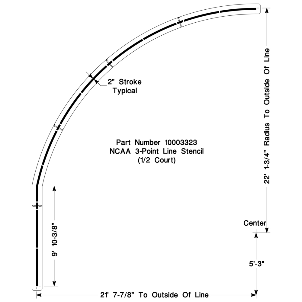 Our NCAA Basketball 3-Point Line Stencil is precision-designed and easy to set up to achieve professional-grade accuracy on any court. Cut from 1/8″ PolyTough Plastic and comes with a Lifetime Warranty. Proudly Made in the USA.