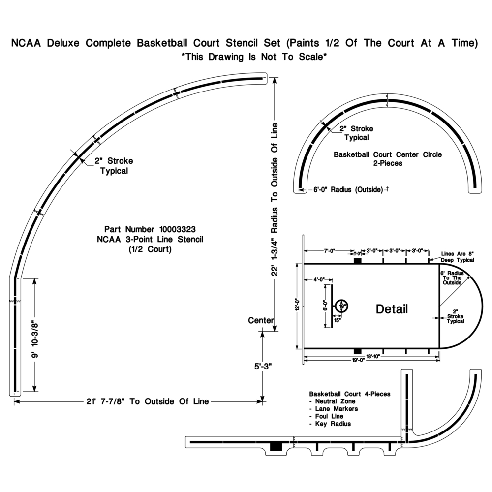This NCAA Basketball Court Stencil Kit has everything you need to mark a NCAA regulation basketball court. Made from our 1/8″ PolyTough Plastic that comes with a Lifetime Warranty. It lies flat and can withstand years of repeated use.10-piece kit includes: NCAA Basketball court (4pc set), center circle (2 pc set), and 3-point line(4pc set). These stencils will paint one half of the court at a time. This provides a great savings versus purchasing the three kits separately.