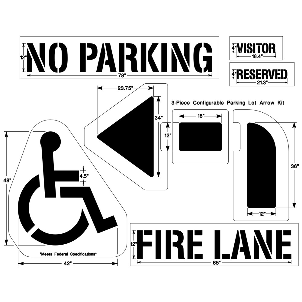 Newstripe’s Parking Lot Starter Stencil Kit includes all the stencils you need to stripe your typical parking lot. The 6pc set includes: Large Handicap Symbol, 3pc Arrow Set, 12″ NO PARKING, 12″ FIRE LANE, 4″ RESERVED, and 4″ VISITOR. Made from our 1/8″ PolyTough Plastic with a Lifetime Warranty.